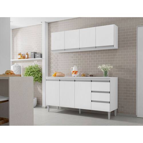 Características: Material da Estrutura: MDP Acabamento: Pintura UV Escala de Brilho: Fosco Aéreo possui 4 portas Balcão possui 3 portas e 3 gavetas Dobradiças em aço Puxadores embutidos Pés em PVC Corrediças metálicas Design moderno