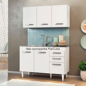 Diferenciais: 06 portas com dobradiças metálicas. 02 gavetas com corrediças metálicas. Puxadores cromados em PVC. Prateleiras internas. Pés reguláveis em PVC. Não acompanha pia inox.