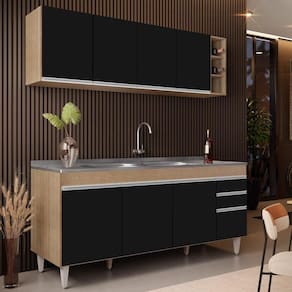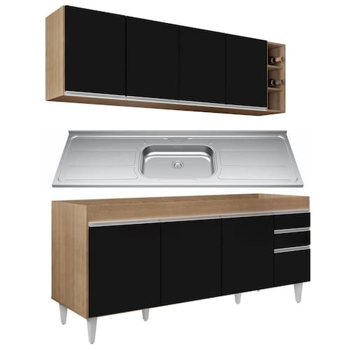 Fabricado em MDP com acabamento em pintura UV, o Balcão Gabinete Dallas Castanho/Preto é uma excelente opção para quem tem uma cozinha com amplo espaço disponível para louça, panelas e demais acessórios utilizados neste ambiente que podem ser aproveitados da melhor maneira. Além da estrutura, também conta com pés reguláveis em PVC, 4 portas convencionais com puxador em alumínio embutido e 1 prateleira interna. Além é claro, de 2 gavetas na lateral também com puxadores embutidos para facilitar o manuseio e com corrediças metálicas e espaço ótimo para guardar seus talheres e utensílios. Ah, e ainda é um balcão com pia inox com características que permitem melhor desempenho ao escoar a água e possibilita a utilização de diferentes objetos sobre ela, tudo para te auxiliar! Mas não acaba por aí! Esse conjunto também conta com a praticidade do armário aéreo Nevada e o Nicho Riad, que possuem a mesma estrutura em MDP, o aéreo apresenta 4 portas de puxadores em perfil alumínio e ainda conta com 1 prateleira interna oferecendo espaço e organização, já o nicho adega oferece três repartições para seus utensílios!
