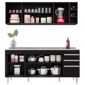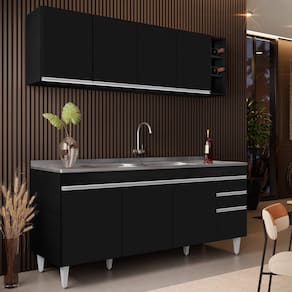 cozinha com amplo espaço disponível para louça, panelas e demais acessórios utilizados neste ambiente que podem ser aproveitados da melhor maneira. Além da estrutura, também conta com pés reguláveis em PVC, 4 portas convencionais, 1 porta basculante com puxador em alumínio embutido e 1 prateleira interna. Além é claro, de 2 gavetas na lateral também com puxadores embutidos para facilitar o manuseio e com corrediças metálicas e espaço ótimo para guardar seus talheres e utensílios. Ah, e ainda é um
