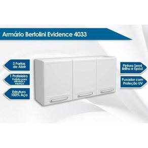 Imagens Meramente Ilustrativas. Não nos responsabilizamos pela montagem/instalação dos produtos. Todas as informações divulgadas são de responsabilidade exclusiva do fabricante/fornecedor. Tipo de Estrutura do Móvel: 100% aço | Quantidade de Portas: 3 Portas de Abrir | Quantidade de Gavetas: 0 | Quantidade de Prateleiras: 1 Prateleira | Garantia: 3 meses | Tipo de Pintura: Epóxi | Características de móveis: Armário Aéreo | Tipo de Acabamento da Pintura: Semi Brilho | Tipo de puxador: c/ Proteção UV | Garantia de Fábrica: Garantia de Fábrica | Ubicação do Móvel: Superior | Cor Principal: Branco | Com prateleiras: Sim | É kit: Não | Requer montagem: Sim | Inclui Tampo: Não | Material das alças: Plástico | Fonte do produto: N/A | Material das corrediças: Metal | Tipo de móveis de cozinha: Armário | Materiais do corpo: Melamina | Alto do armário: N/A | Alto do balcão: N/A | Ancho do armário: N/A | Ancho do balcão: N/A | Modelo detalhado: N/A | Condição do item: Novo | Produto: N/A | Código universal de produto (GTIN): 7890986777354 | Condição do Item: Novo | Link Site: https://www.costaricacolchoes.com.br/produtos.asp?produto=23858 | Numeral: 0 | Não se Aplica: N/A | Não Possui: Não | Link Youtube: https://www.youtube.com/watch?v=eFO3Y3_RLXc | ID Youtube: eFO3Y3_RLXc | Linha/Modelo: Evidence | Cor Cnova: Blush | Cor Meli: Branco | Categoria Trilha: Móveis de Cozinha> Armário Aéreo p/ Cozinha | Categoria - Sub: Armário Aéreo p/ Cozinha | Categoria - Pai: Móveis de Cozinha | Comprimento Embalagem: 28.00 | Largura Embalagem: 120.00 | Altura Embalagem: 53.00 | Kit: 0 | Peso: 12.90 Kg | Peso Real Kg: 12.90 | Peso Cubado: 13.35 | Volumes: 1 | M3: 0.05 | Comprimento/Profundidade: 28 cm | Largura: 120 cm | Altura: 52 cm | Tamanho Montado: Larg:120.00 x Comp/Prof:28.30 x Alt: 52.50 | Comprimento/Profundidade Montado: 28.30 | Largura Montado: 120.00 | Altura Montado: 52.50 | Cor Fabricante: Branco | Data Cadastro: 2023-7-3 8:41:52 | Sigla Estoque: 1 | Marca: Bertolini