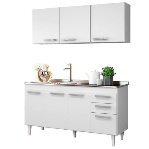 O armário conta com 3 portas que protegem o compartimento interno com 1 prateleira; já o balcão gabinete com pia conta com 3 portas e 3 gavetas, ou seja, bastante espaço para manter tudo no lugar e deixar a sua cozinha mais agradável.