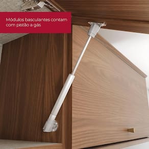 O Armário Aéreo Requinte é fabricado em MDF e MDP com pintura UV texturizada e possui 2 portas basculantes com pistão a gás. Uma das portas conta com vidro reflecta champanhe, que confere um visual moderno e elegante. O detalhe ripado, os puxadores pontuais dourados e o chapéu com acabamento soft valorizam ainda mais o design. Conta com dobradiças metálicas com amortecimento e amplo espaço interno para organização.