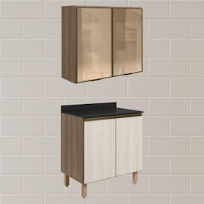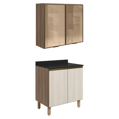 Conjunto de Armário Aéreo e Balcão com Tampo para cozinha, funcional e moderno, ideal para composições que otimizam o espaço com elegância. Fabricado 100% em MDF, com estrutura e tampo de 15mm e forro de fundo de 3mm, o conjunto é composto por 1 armário aéreo com 2 portas de vidro reflecta com dobradiças de 35mm com amortecedores, que garantem fechamento suave e silencioso, além de puxadores em perfil de alumínio e 1 prateleira interna, e 1 balcão com tampo que conta com 2 portas, 1 prateleira interna, puxadores em perfil de alumínio e 4 pés com altura de 15,5cm e regulagem adicional de 1,5cm, assegurando estabilidade em diferentes tipos de piso. Estes móveis chegarão em sua casa separados em 05 volumes.