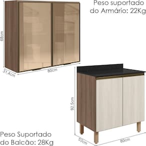 Peso Suportado do Balcão: 28Kg (20Kg tampo, 08Kg prateleira)
