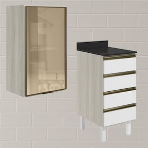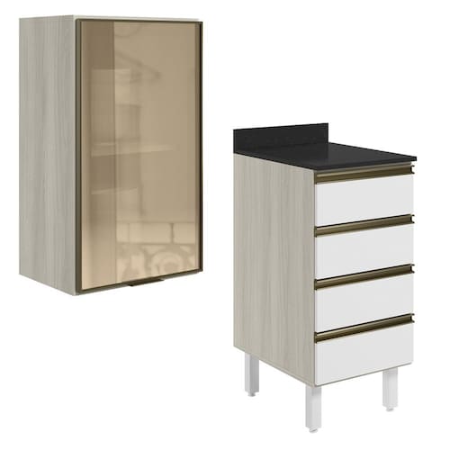 Conjunto de Armário Aéreo Porta em Vidro e Balcão com Tampo para cozinha, funcional e moderno, ideal para composições que otimizam o espaço com elegância. Fabricado 100% em MDF, com estrutura e tampo de 15mm e forro de fundo de 3mm, o conjunto é composto por 1 armário aéreo com 1 porta com frente em vidro reflecta em perfil alumínio com dobradiças de 35mm com amortecedor, que garantem fechamento suave e silencioso, 1 prateleira interna, e 1 balcão com tampo que conta com 4 gavetas com corrediças telescópicas, puxadores em perfil alumínio e 4 pés com altura de 15,5cm e regulagem adicional de 1,5cm, assegurando estabilidade em diferentes tipos de piso. Estes móveis chegarão em sua casa separados em 05 volumes.