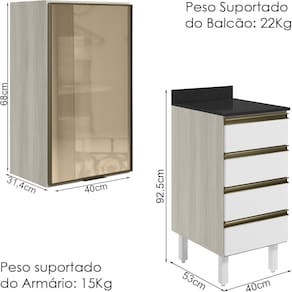 Peso Suportado do Balcão: 22Kg (10Kg tampo, 03Kg prateleira)
