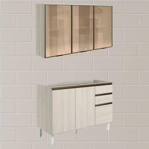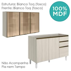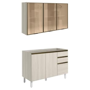 Conjunto de Armario Aereo e Balcao sem Tampo para pia, funcional e moderno, ideal para composições que otimizam o espaço com elegância. Fabricado em MDF, com estrutura de 15mm, forro de fundo de 3mm e acabamento em pintura UV (fosco ou brilho). O Conjunto é composto por 1 armário aéreo com 3 portas de vidro reflecta com dobradiças de 35mm com amortecedor, que garantem fechamento suave e silencioso, além de puxadores em perfil de alumínio e 2 prateleiras internas. O Balcão conta com 3 gavetas com corrediças telescópicas, 1 prateleira interna e 2 portas com dobradiças de 35mm com amortecedores. Os 5 pés possuem altura de 15,5cm com regulagem adicional de 1,5cm, garantindo estabilidade em qualquer piso. Não acompanha tampo nem pia. Estes móveis chegarão em sua casa separados em 04 volumes.