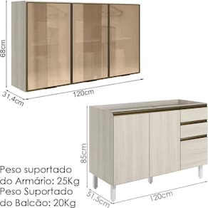 Peso Suportado do Balcão: 20Kg (12Kg gavetas e 8Kg prateleira)