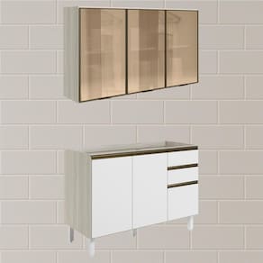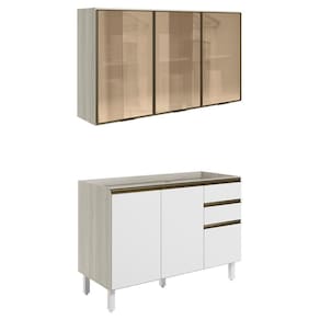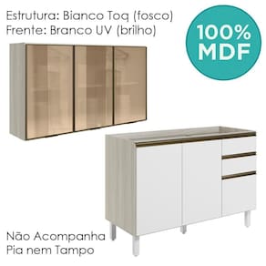 Conjunto de Armario Aereo e Balcao sem Tampo para pia, funcional e moderno, ideal para composições que otimizam o espaço com elegância. Fabricado em MDF, com estrutura de 15mm, forro de fundo de 3mm e acabamento em pintura UV (fosco ou brilho). O Conjunto é composto por 1 armário aéreo com 3 portas de vidro reflecta com dobradiças de 35mm com amortecedor, que garantem fechamento suave e silencioso, além de puxadores em perfil de alumínio e 2 prateleiras internas. O Balcão conta com 3 gavetas com corrediças telescópicas, 1 prateleira interna e 2 portas com dobradiças de 35mm com amortecedores. Os 5 pés possuem altura de 15,5cm com regulagem adicional de 1,5cm, garantindo estabilidade em qualquer piso. Não acompanha tampo nem pia. Estes móveis chegarão em sua casa separados em 04 volumes.