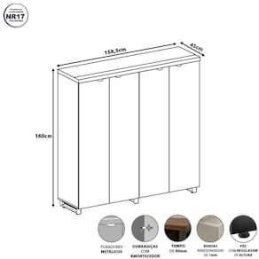 Linha corporativa de alto padrão Acabamento da Porta: BP Acabamento da Prateleira: BP Acabamento dos Pés: Pintura Ambiente Principal: Escritório Armário Suspenso: Não codigo_ean: 7900288244130 Complexidade da Montagem: Média: pode ser montado por mais de uma pessoa e/ou necessite de maior conhecimento para montagem Cor: Louro Preto com Preto Cor do Produto: Louro Preto com Preto Cor Flex: Não Cor Interna: Preto Escala de Brilho: Fosco Escala de Brilho da Porta: Fosco Escala de Brilho da Prateleira: Fosco Espessura do Tampo: 40 mm Formato do Armário: Retangular Itens Inclusos: 1 Armário Alto, Kit Ferragens e Manual da Montagem. Linha ou Coleção: Coleção Corporate F5 Office Manual de Montagem e Instalação: https://cdn2.madeiramadeira.com.br/atributo/casa-lar-shop-ltda/3249235-6595-17592388944699.pdf Marca: F5 Office Material da Porta: MDP Material da Prateleira: MDP Material dos Pés: Metal Material Principal: MDP Montagem Flex: Não, o produto só pode ser montado conforme a imagem. Necessita Montagem: Sim Orientação do Armário: Vertical Origem do Produto: Nacional Pés Reguláveis: Sim Peso: 106 kg Peso Máximo por Prateleira: 10 kg Possui Espelho: Não Possui Mesa Retrátil: Não Possui Pés: 03 Possui Portas: 04 Possui Prateleiras: 06 Quantidade de Armários: 1 Recomendações de Uso, Manutenção e Limpeza: Para uma limpeza mais efetiva, utilizar apenas pano macio e sabão neutro. Não utilizar produtos abrasivos. Sapatas Niveladoras: Sim Sistema de Montagem: Parafusos e buchas metálicas. Suporta Até (kg): 80 kg Tamanho do Armário: Alto (Acima de 150cm) Tipo de Armário: Totalmente Fechado Tipo de Dobradiça/Corrediça da Porta: Metálica Tipo de Puxador da Porta: Externo Marca: Não Informado