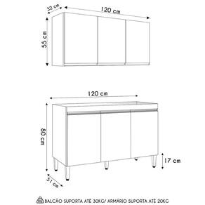 Peso Suportado: Balcão: 20 Kg distribuídos/ Armário: 20 Kg distribuídos.