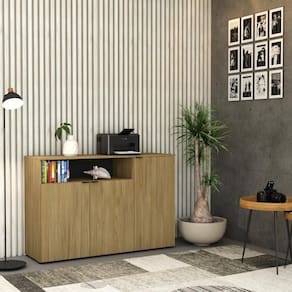 Sobre o ProdutoArmário Aparador C/03 Portas e Nicho 89,5x135x42cm WLAP135 Vermont Oak / BrancoDescrição do Produto:O Armário Aparador com 03 Portas e Nicho WorkLab é uma peça de mobiliário que combina beleza e funcionalidade, perfeita para complementar qualquer escritório moderno. Com linhas limpas, este aparador oferece amplo espaço interno, enquanto o nicho superior é ideal para guardar itens decorativos ou de fácil acesso. Suas portas possuem dobradiças com amortecedor que garantem um fechamento suave e silencioso, além dos puxadores em alumínio, discretos e funcionais. O Armário Aparador WLAP135 WorkLab é mais do que um simples móvel, é uma peça que valoriza o ambiente de trabalho com sua presença marcante e prá linha WorkLab combina funcionalidade, design contemporâneo e durabilidade para criar um ambiente de trabalho eficiente e inspirador. Com uma ampla variedade de peças versáteis, a WorkLab oferece soluções completas para escritórios, home offices e espaços corporativos. Explore os principais componentes dessa linha e ache a escolha certa para quem busca qualidade, design e funcionalidade em móveis de escritório. Transforme seu espaço de trabalho com a elegância e praticidade da linha Inclusos:1 Armário AparadorDimensões dos Produtos:Armário Aparador C/03 Portas e Nicho 89,5x135x42cm WLAP135 Vermont Oak / Branco: 135 x 42 x 89,5 cmInformações Logísticas (Comp. X Prof. X Alt.) 156 x 48 x 13,5 cm - Peso: 43,184 KgPeso Total: 43,184 KgObservações:Não acompanha acessórios decorativos. Imagens meramente ilustrativas.Informações Técnicas / Características:- Cor do Produto: Vermont Oak / Branco- Cor do Predominante: Marrom Claro- Marca: Metalig- Modelo: WLAP135- Linha: WorkLab- Material: Mdp - Acabamento: BP- Escala de Brilho: Fosco- Fita de Borda: Pvc- Possui Portas: 3- Tipo de Porta: Bater- Tipo da Dobradiça: Metálica C/Amortecedor- Possui Gavetas: Não - Possui Chave: Não - Material do Puxador: Alumínio- Possui Prateleiras: 3- Peso Máximo por Prateleira: 10kg - Pés Niveladores: Sim - Acabamento Estrutura: BP- Formato: Retangular- Possui Nicho: 1 - Suporta Até (kg): 70kg- Comprimento: 135cm- Profundidade: 42cm- Altura: 89,5cm - Peso Lí.: 42,125Kg- Recomendações de Uso, Manutenção e Limpeza: Para a limpeza, utilize flanela seca ou pano macio levemente umedecido em água. Utilize um pano seco em seguida. Evite com produtos químicos (solventes, thinner, acetona, etc) e não utilize nenhum tipo de esponja de aço.- Necessita de Montagem: Sim / Acompanha Manual de Montagem- Complexidade da Montagem: Alta: deve ser montado por um montador especializado.- Garantia: 6 meses Quantidade de volumes: 1 | Altura: 89,5 | Comprimento: 135 | Marca: Compace | Modelo: WLAP135 | Necessita montagem: Sim | Quantidade máxima de pedido: 1 | Largura: 42 | Profundidade: 42 Cor: Vermont Oak / Preto