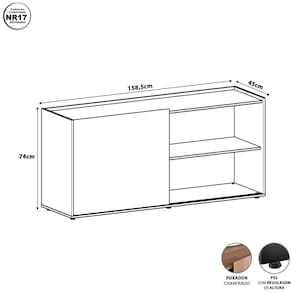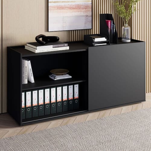 Armário F5 Office com porta de correr e nichos abertos, ideal para organizar com praticidade e estilo. Versátil e moderno, adapta-se a escritórios, home offices e ambientes de estudo, otimizando o espaço com elegância.