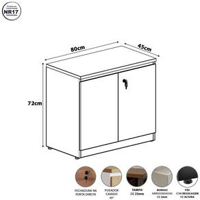 Altura: 72 cm Acabamento da Porta: BP Acabamento da Prateleira: BP Acabamento dos Pés: Pintura Ambiente Principal: Escritório Armário Suspenso: Não codigo_ean: 7900288256768 Complexidade da Montagem: Média: pode ser montado por mais de uma pessoa e/ou necessite de maior conhecimento para montagem Cor: Macadâmia / Branco Cor do Produto: Macadâmia / Branco Cor Flex: Não Cor Interna: Branco Escala de Brilho: Fosco Escala de Brilho da Porta: Fosco Escala de Brilho da Prateleira: Fosco Espessura do Tampo: 25 mm Formato do Armário: Quadrado Itens Inclusos: 1 Armário, Kit Ferragens e Manual da Montagem. Linha ou Coleção: Corporate F5 Manual de Montagem e Instalação: https://product-hub-prd.madeiramadeira.com.br/675486307/documents/b5c4bb7f-6c57-427f-9e39-f7a9a71a6b6e3272926659517604513512033.pdf Marca: F5 Office Material da Porta: MDP Material da Prateleira: MDP Material dos Pés: Metal Material Principal: MDP Montagem Flex: Não, o produto só pode ser montado conforme a imagem. Necessita Montagem: Sim Orientação do Armário: Horizontal Origem do Produto: Nacional Pés Reguláveis: Sim Peso: 30 kg Peso Máximo por Prateleira: 10 kg Possui Espelho: Não Possui Mesa Retrátil: Não Possui Nicho: Não Possui Pés: 04 Possui Portas: 02 Possui Prateleiras: 01 Quantidade de Armários: 1 Recomendações de Uso, Manutenção e Limpeza: Para uma limpeza mais efetiva, utilizar apenas pano macio e sabão neutro. Não utilizar produtos abrasivos. Sapatas Niveladoras: Sim Sistema de Montagem: Parafusos e buchas metálicas. Suporta Até (kg): 80 kg Tamanho do Armário: Baixo (Até 90cm) Tipo de Armário: Totalmente Fechado Tipo de Dobradiça/Corrediça da Porta: Metálica Tipo de Puxador da Porta: Embutido Marca: Não Informado