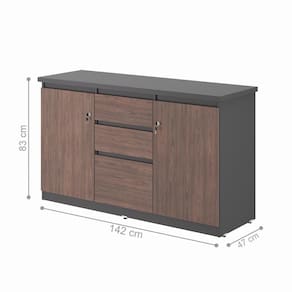 Pés niveladores de altura e 1 prateleira interna com portas e chave.