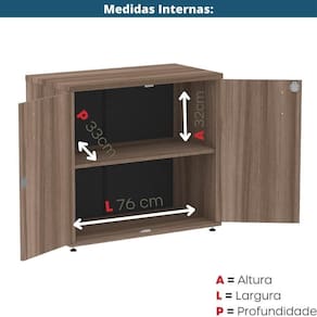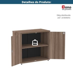 Acompanha uma prateleira interna fixa com capacidade para até 15kg, ideal para organização de documentos e materiais de uso diário. As portas são do tipo pivotante, sem dobradiças, com sistema de articulação superior e inferior, e fechadura cilíndrica tipo Yale com duas chaves, garantindo e praticidade no dia a dia.