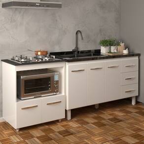 Características do Balcão de Pia Carine 138 cm: Altura: 83,5 cm (com pés) | 67 cm (sem pés) Largura: 138 cm (ideal para pia de 140 cm) Profundidade: 50 cm Material: MDP (madeira) Portas: 3 Gavetas: 3 Prateleiras: 1 Puxadores: 6 plásticos cromados Pés: 6 reguláveis de plástico (altura: 16,5 cm, ajustáveis até 18 cm) Corrediças: Metálicas Acompanha tampo: Não Indicações de Uso: Cozinha