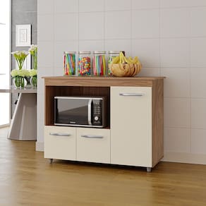 Características: Estrutura em MDP Acabamento em pintura UV 03 Portas com Dobradiças Metálicas Puxadores em Plástico Cromados Pés Fixos Amplo Espaço Interno para Organizar Utensílios Nicho para Forno ou Microondas