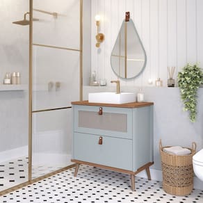 Gabinete para Banheiro com porta, gaveta, prateleira, cuba e espelheira.