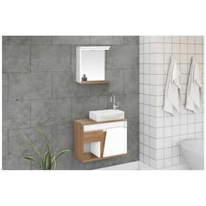 Armario Banheiro Kit Sicilia 67,5cm Nogal RoratoCompacto e imponente, os armários da Linha Sicília são excelentes para ambientes pequenos e charmosos, aliando praticidade e beleza. Possui pia de apoio em louça, com tamanhos que se adequam até nos menores espaços, sem deixar de lado a funcionalidade e beleza facilitando sua combinação em qualquer ambiente.Composição ArmárioEstruturaEm MDP – BP branco 15mm com lâmina melamínico e bordas encabeçadas.PortasEm placa de MDP – BP 15mm, amadeirado fosco.Dobradiça em aço zincado.O perfil da porta é com fita de bordaBase Inferior e Lateral EsquerdaEm placa de MDP – BP 15mm, amadeirado fosco.Bordas encabeçadas.** Preço do produto em PC **