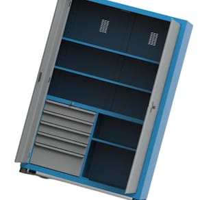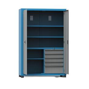 Armário Para Ferramentas com 2 Prateleiras Reguláveis e 1 Fixa, 5 Gavetas é fabricado em chapas de aço carbono resistentes, recebe tratamento de superfície anticorrosivo e finalmente recebe um acabamento de tinta eletrostática a pó. É ideal para quem busca um produto diferenciado no mercado, de alta qualidade e durabilidade!