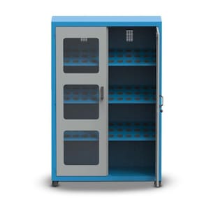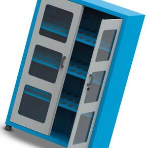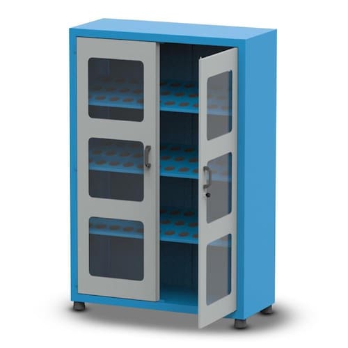 O Armário Porta Cone ISO30 para 108 peças com 3 prateleiras e Visor de Acrílico possui pés niveladores e detém uma capacidade de 50kg por prateleira.