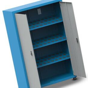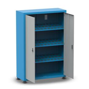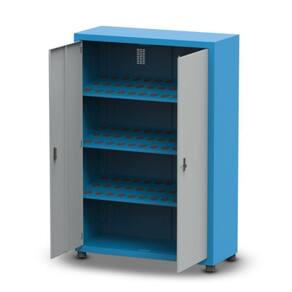 O Armário Porta Cone ISO50 para 72 peças com 3 prateleiras possui pés niveladores e detém uma capacidade de 50kg por prateleira.