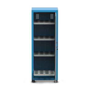 O Armário Porta Cone ISO50 para 48 peças com 4 prateleiras possui pés niveladores e detém uma capacidade de 25kg por prateleira.