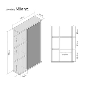 Suas medidas totais são: 70cm de Altura x 42cm de Largura x 13cm de Profundidade. Nichos Internos: 20cm de Altura x 22,5cm de Largura x 13cm de Profundidade. Nichos Externos: 20cm de Altura x 14cm de Largura x 13cm de Profundidade. O espelho mede: 66cm de Altura x 26cm de Largura. Peso: 8,5kg.