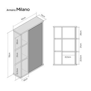 Suas medidas totais são: 70cm de Altura x 42cm de Largura x 13cm de Profundidade. Nichos Internos: 20cm de Altura x 22,5cm de Largura x 13cm de Profundidade. Nichos Externos: 20cm de Altura x 14cm de Largura x 13cm de Profundidade. O espelho mede: 66cm de Altura x 26cm de Largura. Peso: 8,5kg.
