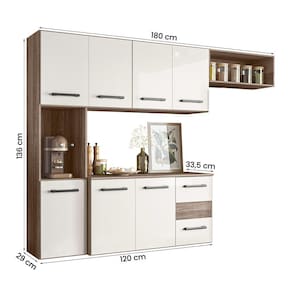 Marca: Nicioli; Linha: Cozinha; Modelo: Juliete; Altura: 136 cm; Largura: 180 cm; Profundidade: 33,5 cm; Material da estrutura: MDP de 12 mm (estrutura) e MDP de 15 mm (portas); Acabamento: Pintura; Quantidade de portas: 07; Material de dobradiças: Metálicas; Quantidade de gavetas: 02; Material das corrediças: Metálicas; Com puxador: Sim; Material do puxador: Plástico; Quantidade prateleiras: 01; Pés com regulagem: Não; Peso suportado: 45 kg distruibuídos; Requer montagem: Sim (kit montagem incluso); Condição do item: Novo; É kit: Não; Altura da embalagem: 8,6 cm; Largura da embalagem: 61,3 cm; Comprimento da embalagem: 137,4 cm; Peso: 43,3 kg; Embalagem do envio: Papelão e plástico; Informações adicionais: - Os objetos que ambientam as fotos não acompanham o produto; - O produto será entregue desmontado; - É de inteira responsabilidade do cliente a montagem do produto e/ou instalação, custos de transporte por escadas e/ou elevadores, guincho ou içamento, assim como possíveis irregularidades provenientes de manuseio inadequado; - Embora o produto acompanhe o manual de montagem, verifique a complexidade antes de decidir montá-lo sozinho, recomendamos que contrate um profissional de sua confiança; - Fique atento, nossas cores podem sofrer alterações dependendo do seu monitor; - ANTES DE MONTAR O SEU PRODUTO, certifique-se que todas as instruções dispostas no manual, bem como todas as ferragens descritas, estejam presentes dentro da embalagem. Verifique se há alguma peça danificada, caso esteja, prestaremos a devida assistência dentro do prazo da garantia.