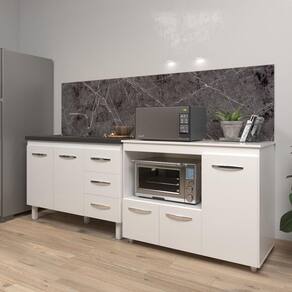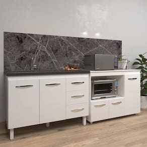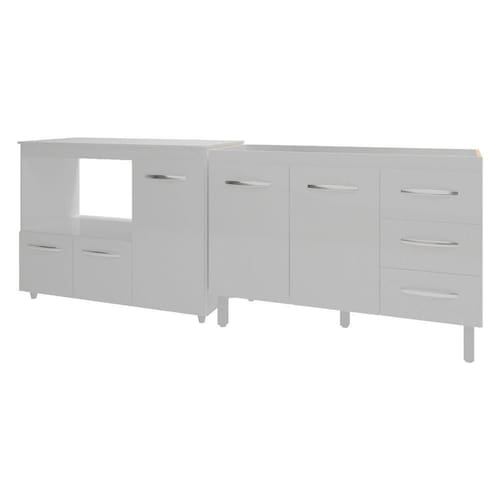 Armário Cozinha Balcão Gabinete De Pia 120 Cm Bruna E Balcão Lilian Para Microondas E Forno Elétrico Branco O Kit Balcão para Pia 118 cm Bruna e Balcão para Micro-ondas e Forno Elétrico Lilian oferece uma solução completa e elegante para a sua cozinha. Com um design moderno e funcional, este conjunto é ideal para quem busca organização e estilo no ambiente culinário. Características do Balcão de Pia Bruna 118 cm: Altura: 83,5 cm (com pés) | 69 cm (sem pés) Largura: 118 cm (ideal para pia de 120 cm) Profundidade: 50 cm Material: MDP (madeira) Portas: 2 Gavetas: 3 Prateleiras: 1 Puxadores: 5 plásticos cromados Pés: 5 reguláveis de plástico (altura: 16,5 cm, ajustáveis até 18 cm) Corrediças: Metálicas Acompanha tampo: Não Indicações de Uso: Cozinha