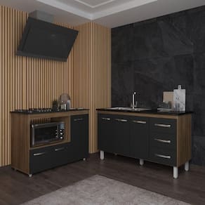 Armário Cozinha Carine Gabinete De Pia 140 Cm E Balcão Alana Para Cooktop 5 Bocas E Forno Ou Microondas Savana Preto Renove sua cozinha com o Kit Balcão para Pia 140 cm Carine e Balcão para forno e Cooktop Alana 5 Bocas. Desenvolvido com materiais duráveis e acabamento UV de alta qualidade, este conjunto alia praticidade e elegância. Com amplo espaço para organização, ele torna sua cozinha mais eficiente e atraente. Ideal para quem deseja unir funcionalidade e estilo em um só ambiente! Características do Balcão de Pia Carine 138 cm: Altura: 83,5 cm (com pés) | 67 cm (sem pés) Largura: 138 cm (padrão para pia de 140 cm) Profundidade: 50 cm Material: MDP (madeira) Portas: 3 Gavetas: 3 Prateleiras: 1 Puxadores: 6 plásticos cromados Pés: 6 reguláveis de plástico (altura: 16,5 cm, ajustáveis até 18 cm) Corrediças: Metálicas Acompanha tampo: Não Indicação de Uso: Cozinha
