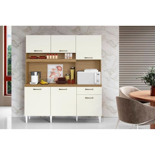 A Cozinha Compacta 6 Portas 1 Gaveta Siena Aramóveis. Produzida em MDP e MDF com espessuras de 3mm, 12mm e 15mm, garantindo uma estrutura resistente e durável. Seu amplo espaço interno oferece firmeza ao móvel, e a gaveta espaçosa conta com excelente fixação e corrediça de metal, assegurando funcionalidade. Equipada com dobradiças metálicas para maior durabilidade ao abrir e fechar as portas. O acabamento em verniz alto-brilho não só conserva o móvel, mas também mantém seu brilho constante, conferindo beleza, resistência e durabilidade.