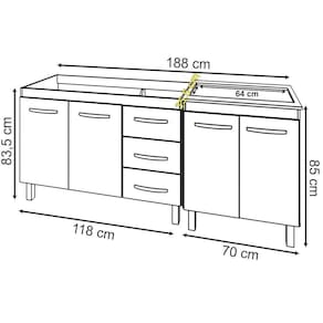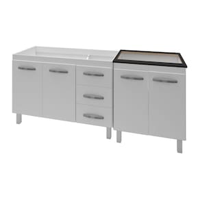Características do kit montado: Largura 188 cm (lado a lado os dois balcões). Profundidade 53 cm (Profundidade do balcão para cooktop com tampo, sem tampo os balcões possuem 50 cm de profundidade.) Altura: 85 cm (Altura do balcão para cooktop com tampo, sem tampo os balcões possuem 83,5 cm de altura.)