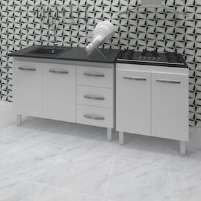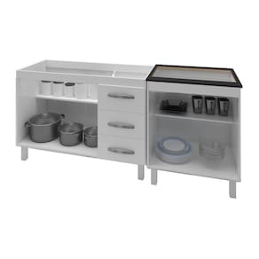 Armário Cozinha Gabinete Pia De 120 Cm Bianca Com Balcão Cooktop 5 Bocas Branco Jade O conjunto Balcão Gabinete para pia de cozinha Bianca e Balcão para Cooktop Jade é um conjunto indispensável em sua cozinha onde a praticidade e ergonomia andam lado a lado, são cores sofisticadas e com nova forma de montagem bem mais pratica, adaptando as suas necessidades e de sua cozinha, são diversos modelos para lhe atender, conheça você também nossa linha. Características Balcão de Pia Bianca 118 cm: Altura:83,5 cm (Com os Pés). Altura sem os pés: 67 cm. Largura: 118 cm (Padrão para pia de 120 cm). Profundidade: 50 cm. Material: MDP (madeira). Portas: 2 Portas. Gavetas: 3 Gavetas. Prateleiras: 1 Prateleira. Puxadores: 5 puxadores plásticos cromados Pés: 5 pés reguláveis de plástico. Altura dos pés:16,5 cm Regulagem dos pés: Somente para nivelamento, (Chega no máximo a 18 cm). Corrediças: Metálicas. Acompanha tampo: Não