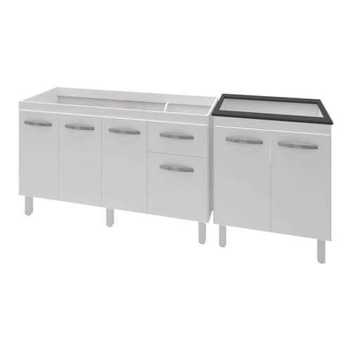Kit Balcão Para Pia de 140 cm Camile com Balcão para Cooktop Jade 5 bocas: Perfeito para tornar a sua cozinha ainda mais atraente e elegante. Desenvolvido com material de alta qualidade, pintura UV, acabamento perfeito nos detalhes, este kit é o que estava faltando para tornar a sua cozinha o seu cantinho ainda mais especial! Adquira Já o seu! Características Balcão de Pia Camile 138 cm:Altura:83,5 cm (Com os Pés).Altura sem os pés: 67 cm.Largura: 138 cm (Padrão para pia de 140 cm).Profundidade: 50 cm.Material: MDP (madeira).Portas: 4 Portas.Gavetas: 1 Gaveta.Prateleiras: 1 Prateleira.Puxadores: 6 puxadores plásticos cromadosPés: 6 pés reguláveis de plástico.Altura dos pés:16,5 cmRegulagem dos pés: Somente para nivelamento, (Chega no máximo a 18 cm).Corrediças: Metálicas.Indicações de Uso: Cozinha Acompanha tampo: Não Características Balcão Para Cooktop Jade 5 Bocas:Altura: 85 cm (Altura do produto com os pés e com o tampo)Altura sem os pés: 68,5 cmLargura: 70 cmProfundidade: 53 cm*A largura 70 cm e Profundidade 53 cm correspondem ao tampo do balcão, sem o tampo o balcão tem 68 cm de Largura e 50 cm de profundidade (mesma profundidade do balcão de pia).Dimensões do Nicho (Recorte para encaixar o cooktop): 64 x 35,5 cmMaterial: MDP Portas: 2 PortasPrateleiras: 1 prateleira (Opcional)Puxadores: 2 puxadores plásticos cromadosPés: 4 pés reguláveis de plástico.Altura dos pés: 16,5 cmRegulagem dos pés: Somente para nivelamento, (Chega no máximo a 18 cm).Acompanha tampo: Sim Características do kit montado: Largura 208 cm (lado a lado os dois balcões). Profundidade 53 cm (Profundidade do balcão para cooktop com tampo, sem tampo os balcões possuem 50 cm de profundidade.) Altura: 85 cm (Altura do balcão para cooktop com tampo, sem tampo os balcões possuem 83,5 cm de altura.) *Os Móveis não são acoplados, são montados individualmente e podem ser ultilizados em locais diferentes. *Imagem meramente ilustrativa, não acompanha objetos decorativos, é somente os dois balcões.