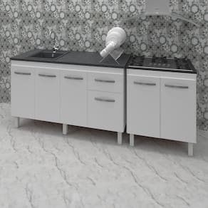 Características do kit montado: Largura 208 cm (lado a lado os dois balcões). Profundidade 53 cm (Profundidade do balcão para cooktop com tampo, sem tampo os balcões possuem 50 cm de profundidade.) Altura: 85 cm (Altura do balcão para cooktop com tampo, sem tampo os balcões possuem 83,5 cm de altura.)