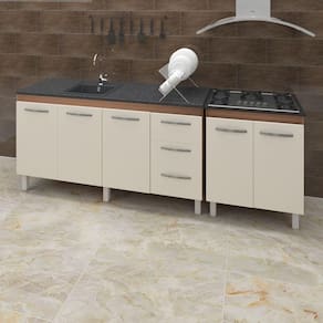 Armário Cozinha Gabinete Pia De 150 Cm Diana Com Balcão Cooktop 5 Bocas Savana Frente Off-white Jade O Kit Balcão para pia de 150 cm Diana com Balcão para Cooktop 5 Bocas Jade vai trazer para a sua casa praticidade, elegância e tornar a sua cozinha um ambiente ainda mais especial. Por serem móveis da mesma linha, eles combinam, deixam o ambiente harmônico, diferenciado e ainda mais atraente! A sua cozinha merece este lindo kit da Moblis Móveis, adquira já o seu! Características: Altura:83,5 cm (Com os Pés). Altura sem os pés: 67 cm. Largura: 148 cm (Padrão para pia de 150 cm). Profundidade: 50 cm. Material: MDP (madeira). Portas: 3 Portas. Gavetas: 3 Gavetas. Prateleiras: 1 Prateleira. Puxadores: 6 puxadores plásticos cromados Pés: 6 pés reguláveis de plástico. Altura dos pés:16,5 cm Regulagem dos pés: Somente para nivelamento, (Chega no máximo a 18 cm). Corrediças: Metálicas. Indicações de Uso: Cozinha *Imagem meramente ilustrativa, Não acompanha tampo ou pia nem objetos decorativos, é somente o balcão.