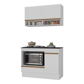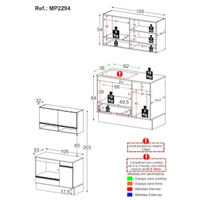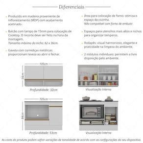 Conteúdo da Embalagem: 1 (um) Balcão para Cooktop com Tampo 105cm 1 (um) Armário de Cozinha Aéreo 105cm Kit Rodapés Kit Ferragem Manual de Montagem