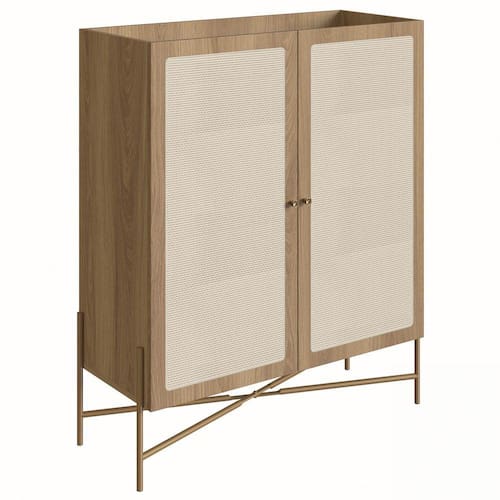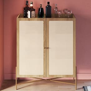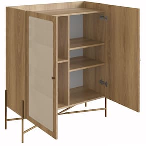 Cristaleira / Bar 28929, Linha Oslo Artesano. Traz como característica um traço artesanal, suave e acolhedor. Possui estrutura em MDP de 15mm, acabamento em pintura BP na cor Hanover (Fosco), e Pés de tubo metálico em aço com pintura epóxi na cor dourada, costas em HDF 3mm BP na cor branco. Composto por duas portas com dobradiças metálicas em aço com proteção anticorrosão, puxadores de poliestireno na cor Dourado, aplique de tela sintética (PVC com poliéster), fixada na parte externa das portas, prateleiras e divisão interna, as extremidades dos pés possuem ponteiras plásticas para evitar atrito do móvel com o piso, conta ainda com longarina metálica embaixo do móvel para evitar empenamento. Com design escandinavo minimalista, é a opção ideal para um ambiente com toque sofisticado e ao mesmo tempo aconchegante. Mais produtos da Linha Oslo, você encontra em nosso site, podendo fazer a composição completa para sua casa, são diversos itens com design prático e funcional para tornar a vida mais facil e a casa mais alegre. Este móvel chegará em sua casa separado em 02 volumes.