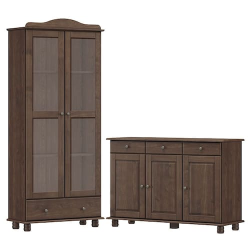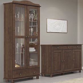Armário Cristaleira e Balcão, um conjunto projetado para quem busca móveis que combinam elegância e funcionalidade para complementar sua decoração. Produzido em madeira maciça de pinus de reflorestamento, sua estrutura robusta garante durabilidade e resistência. O Armário Cristaleira conta com 02 portas de vidro incolor e 01 gaveta, e o Balcão com 03 portas e 03 gavetas. As portas possuem dobradiças com amortecimento, e as gavetas corrediças telescópicas, que proporcionam abertura suave e silenciosa. Com pintura acetinada com verniz PU e UV, que realça a beleza natural da madeira enquanto protege contra desgastes do dia a dia e puxadores metálicos que adicionam um toque moderno ao design clássico do produto. Os pés torneados em madeira maciça garantem estabilidade e charme artesanal. Oferecem amplo espaço interno, perfeitos para organizar louças, objetos decorativos ou itens de sua preferência. Estes móveis chegarão em sua casa separados em 03 volumes.