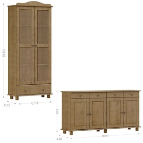 Armário Cristaleira e Balcão, um conjunto projetado para quem busca móveis que combinam elegância e funcionalidade para complementar sua decoração. Produzido em madeira maciça de pinus de reflorestamento, sua estrutura robusta garante durabilidade e resistência. O Armário Cristaleira conta com 02 portas de vidro incolor e 01 gaveta, e o Balcão com 04 portas e 04 gavetas. As portas possuem dobradiças com amortecimento, e as gavetas corrediças telescópicas, que proporcionam abertura suave e silenciosa. Com pintura acetinada com verniz PU e UV, que realça a beleza natural da madeira enquanto protege contra desgastes do dia a dia e puxadores metálicos que adicionam um toque moderno ao design clássico do produto. Os pés torneados em madeira maciça garantem estabilidade e charme artesanal. Oferecem amplo espaço interno, perfeitos para organizar louças, objetos decorativos ou itens de sua preferência. Estes móveis chegarão em sua casa separados em 03 volumes.