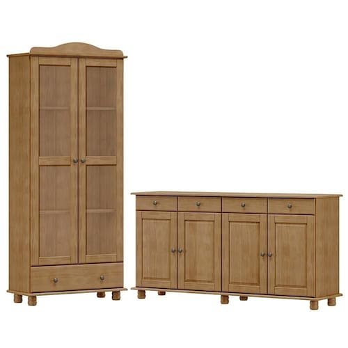 Armário Cristaleira e Balcão, um conjunto projetado para quem busca móveis que combinam elegância e funcionalidade para complementar sua decoração. Produzido em madeira maciça de pinus de reflorestamento, sua estrutura robusta garante durabilidade e resistência. O Armário Cristaleira conta com 02 portas de vidro incolor e 01 gaveta, e o Balcão com 04 portas e 04 gavetas. As portas possuem dobradiças com amortecimento, e as gavetas corrediças telescópicas, que proporcionam abertura suave e silenciosa. Com pintura acetinada com verniz PU e UV, que realça a beleza natural da madeira enquanto protege contra desgastes do dia a dia e puxadores metálicos que adicionam um toque moderno ao design clássico do produto. Os pés torneados em madeira maciça garantem estabilidade e charme artesanal. Oferecem amplo espaço interno, perfeitos para organizar louças, objetos decorativos ou itens de sua preferência. Estes móveis chegarão em sua casa separados em 03 volumes.