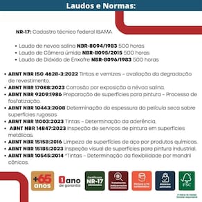 Possui diversos certificados que garantem sua qualidade e conformidade com normas técnicas. Ela atende à norma NR-17 de ergonomia, com laudo de conformidade emitido por certificado pela ABERGO, e possui certificação do INMETRO conforme a NBR 8094:1983, que avalia a resistência à corrosão por meio de testes de névoa salina. Além disso, é acompanhada de laudos de câmaras úmidas (NBR 8095/2015) e de dióxido de enxofre (NBR 8096/1983), comprovando sua durabilidade e proteção contra condições ambientais adversas.