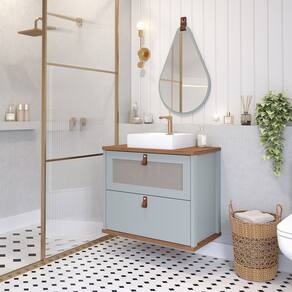 CARACTERÍSTICAS: - Gabinete para Banheiro com Cuba desenvolvido em MDF - Porta em MDF revestido com tela sintética de fácil limpeza e antimofo - Acabamento em pintura BP. - Cuba em mármore sintético. - Amplo espaço interno - Porta com pistão à gás - Puxadores de estilo retrô em couro sintético.