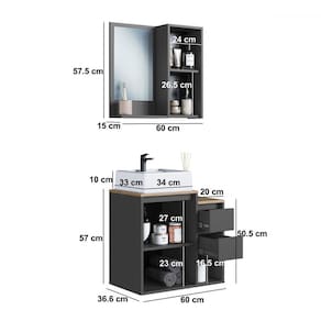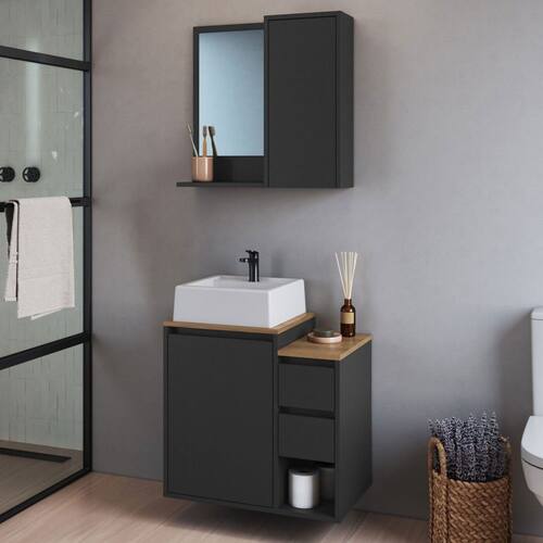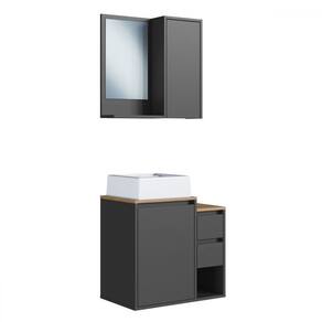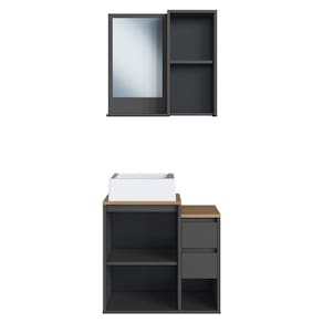 O(a) Armário de Banheiro Bari 2 Portas 2 Gavetas com Cuba e Espelho Grafite - Art In Móveis é produzido em MDP na escala de brilho Fosco, e possui um grau de dificuldade de montagem: Médio.