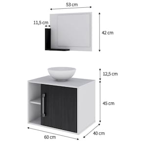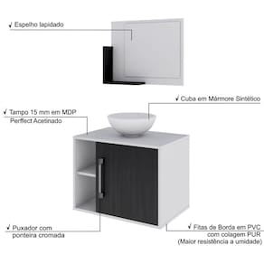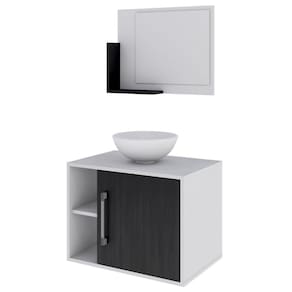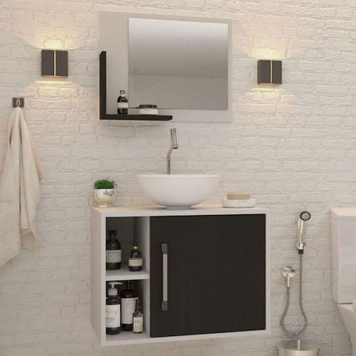 O(a) Armário de Banheiro com Cuba e Espelho 1 Porta 2 Prateleiras Branco Chess/Preto ônix 13688 - Compace é produzido em MDP na escala de brilho Fosco, e possui um grau de dificuldade de montagem: Médio.