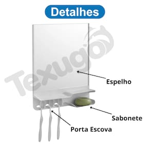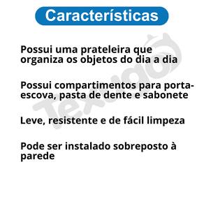 Possui compartimentos para porta-escova, pasta de dente e sabonete.
